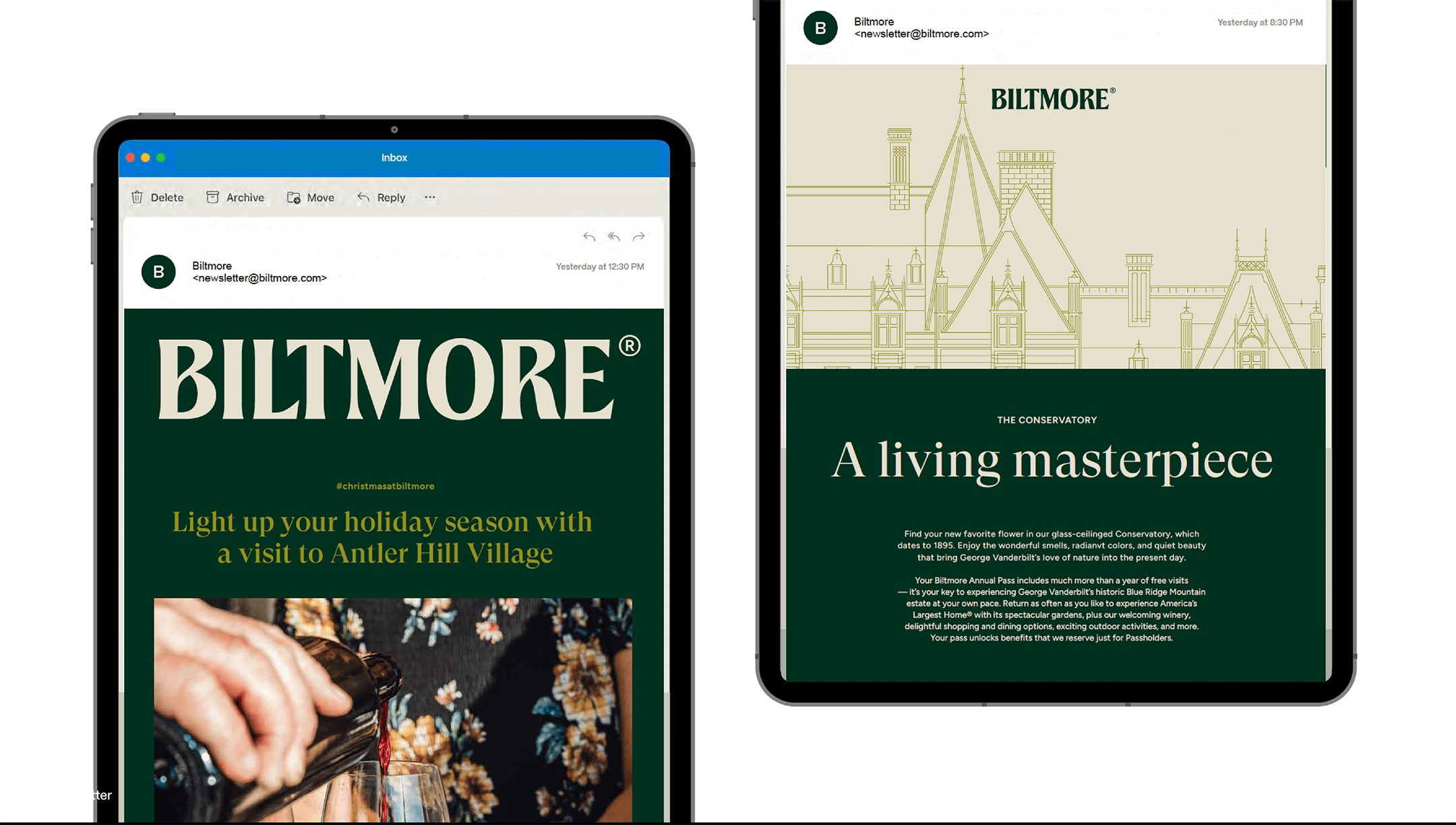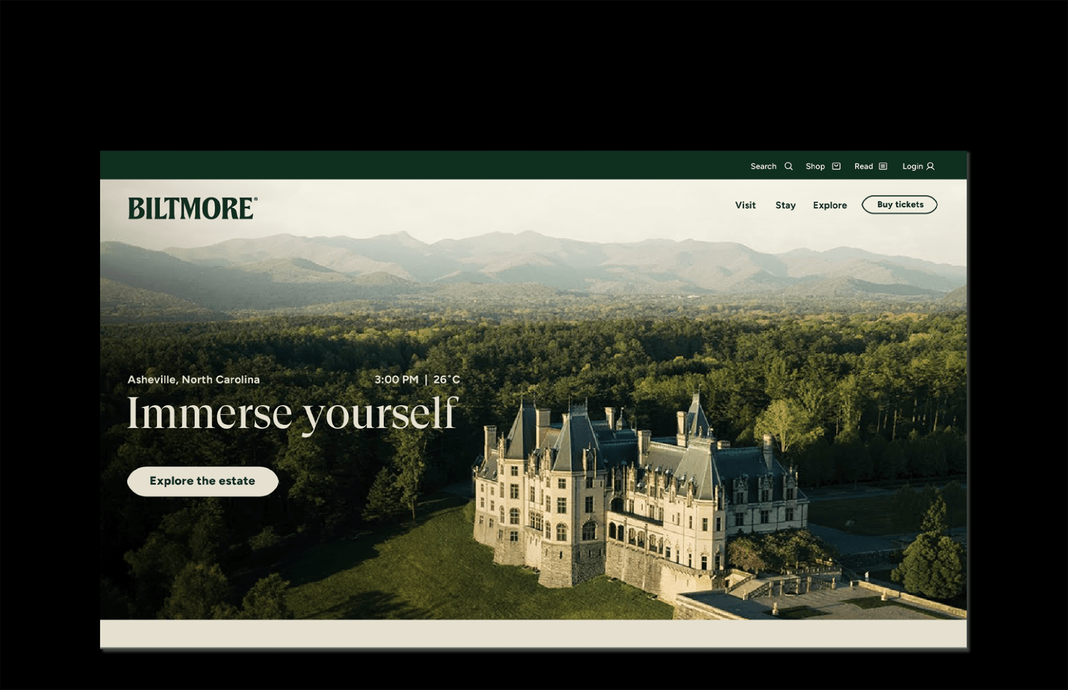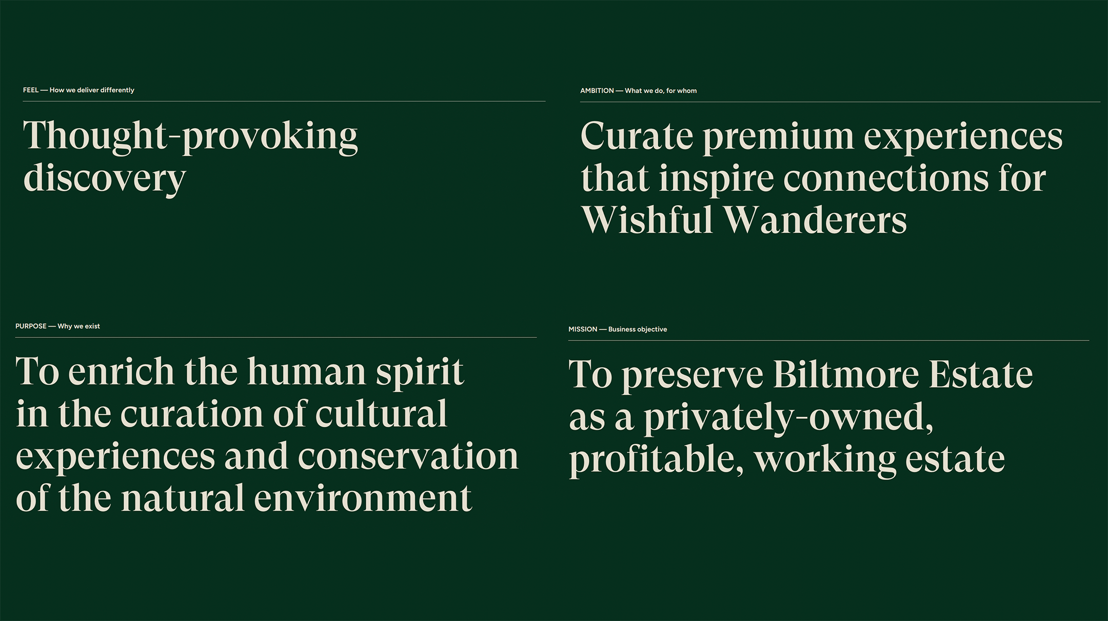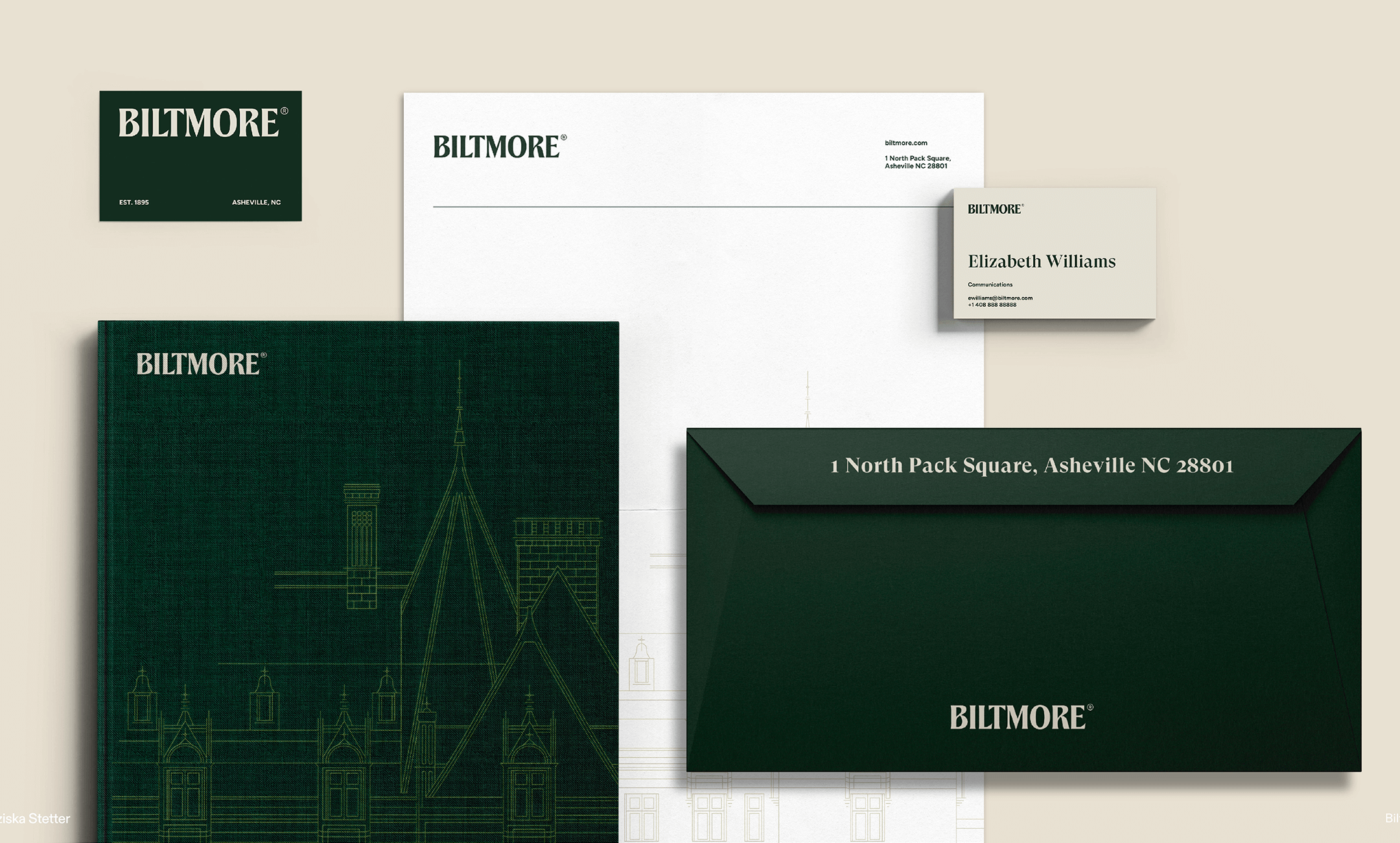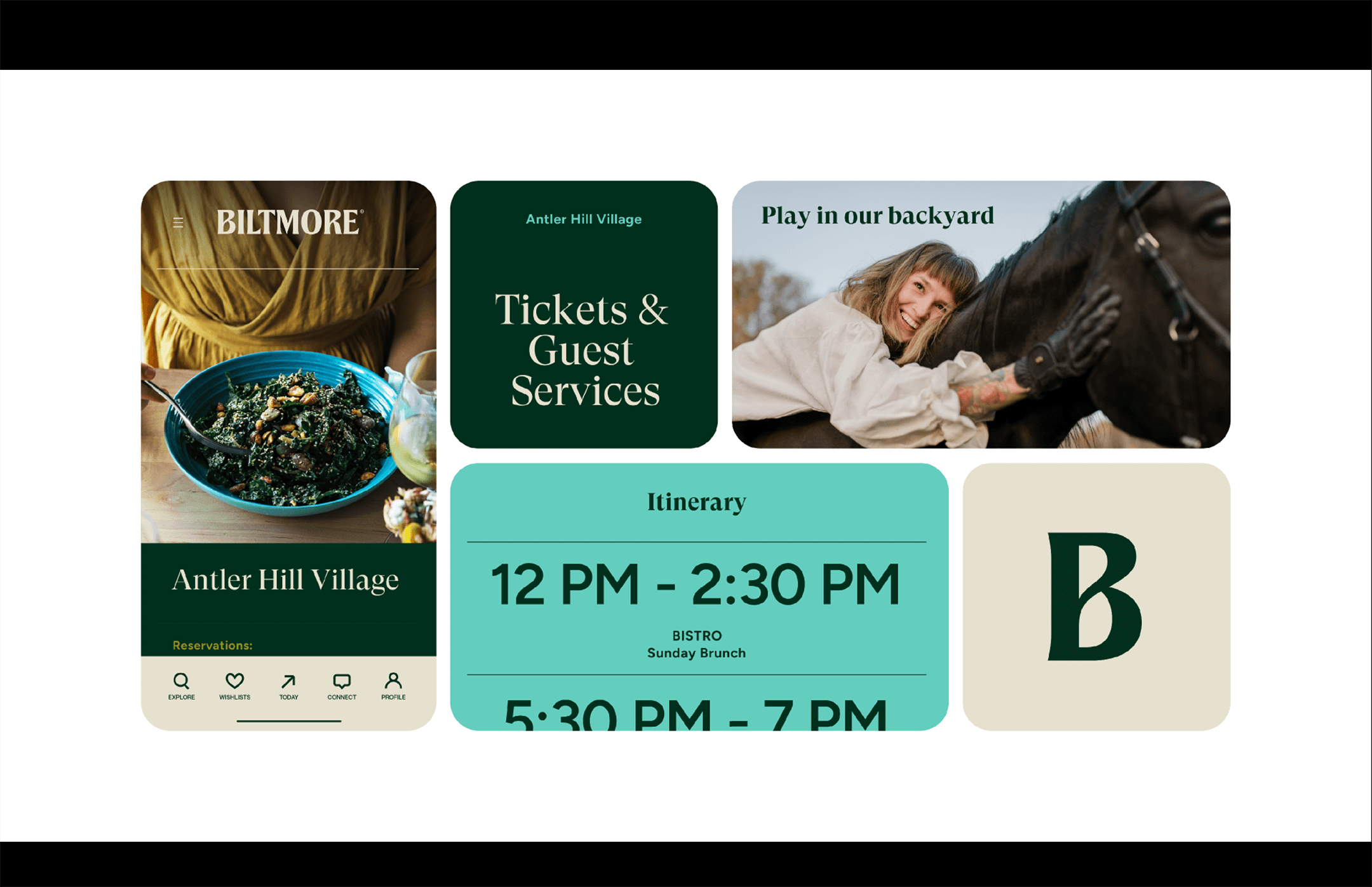 Biltmore’s new strategy and identity are rooted in George Vanderbilt’s cultural curiosity, Edith Vanderbilt’s commitment to community, and Olmsted’s landscapes that inspire exploration and restoration. This legacy continues through immersive experiences across 8,000 acres where architecture, nature, craft, and hospitality connect guests to something meaningful. Our strategy places the guest at the center. Every touchpoint should evoke wonder, care, and thoughtful detail. The custom wordmark reflects seamless experiences, with leaf-like shapes in the B and R and forms drawn from estate architecture. The color palette, inspired by the property, brings authenticity to every expression. Each interaction becomes part of a story over 125 years in the making.