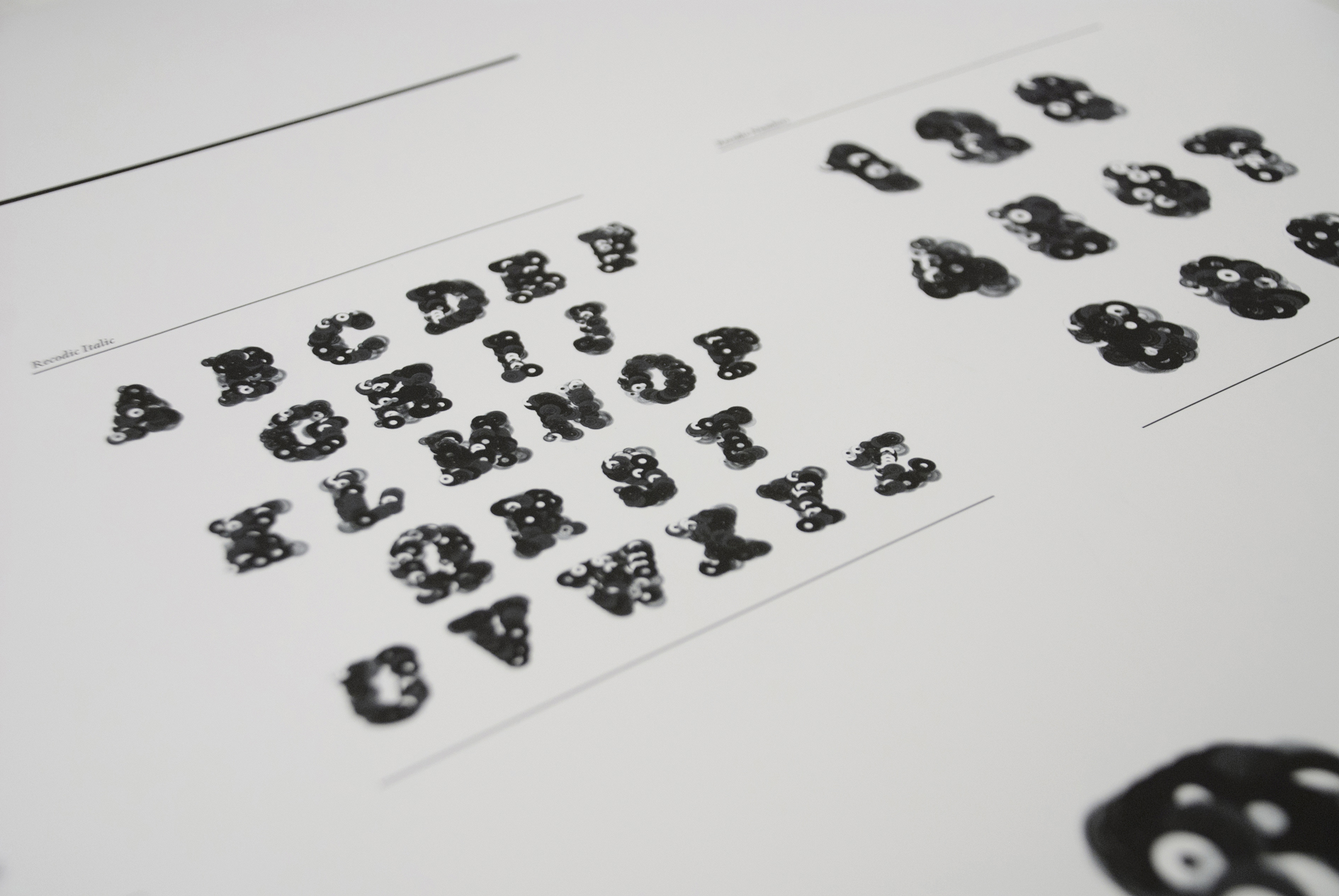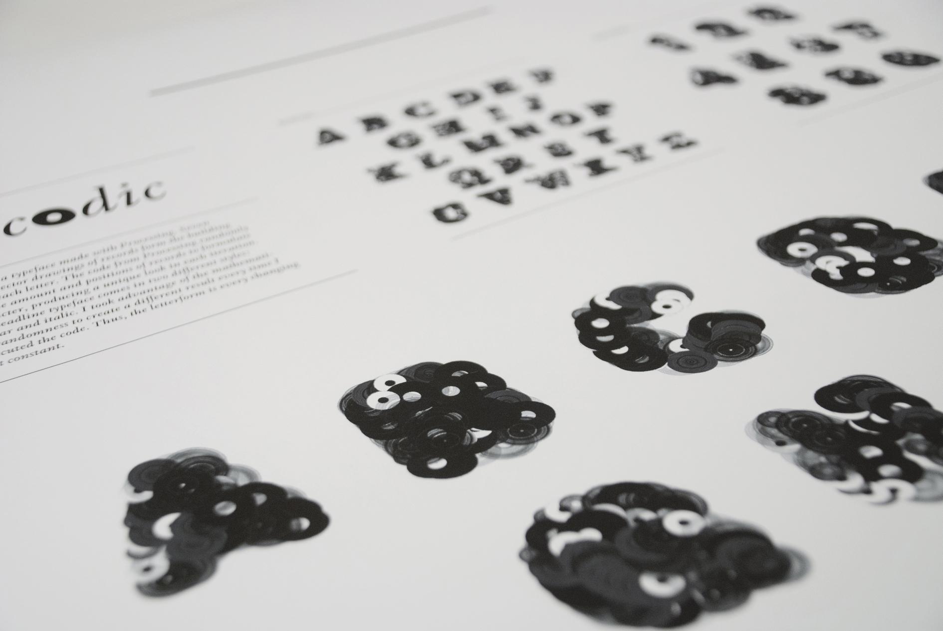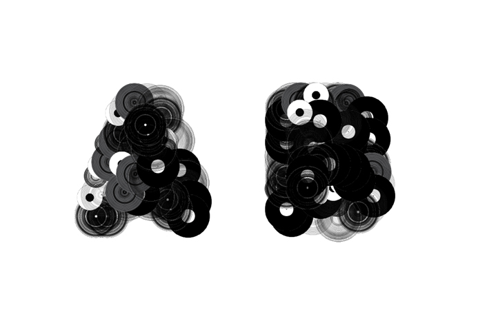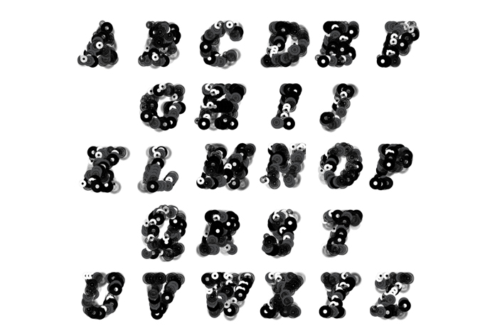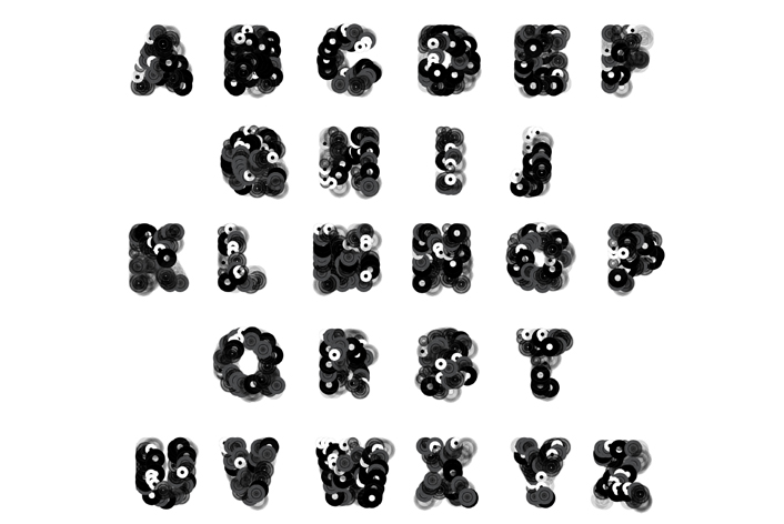 A typeface following the concept of the book "This is not a book about Donuts", created with Processing. Seven vector drawings of records form the building blocks of each letter. The code randomly selects the amount and positions of records to formulate a character, producing a unique look in each iteration. By taking advantage of the mathematical randomness it creates a different result every time executing the code.Thus, the letterform is every changing yet constant. This headline typeface exists in regular and italic. 2011