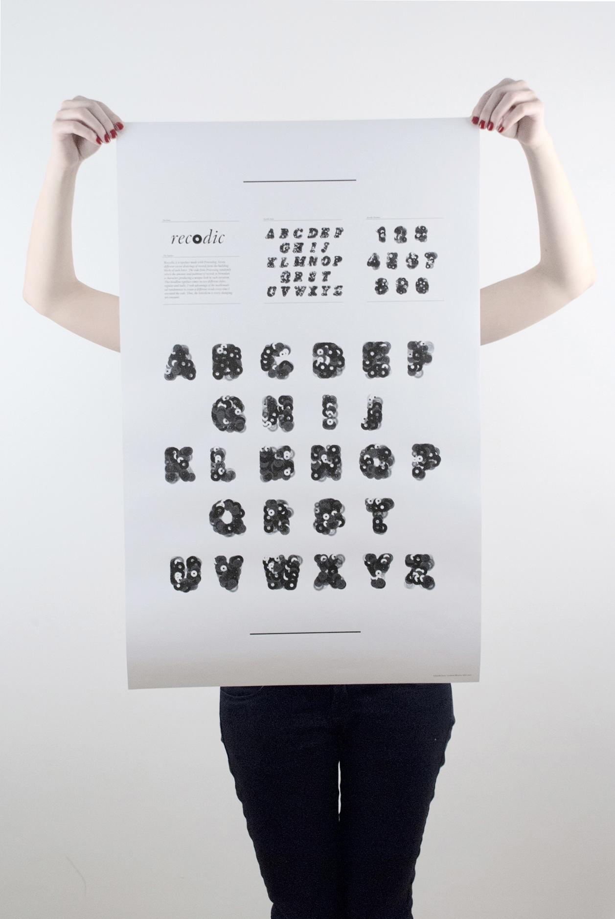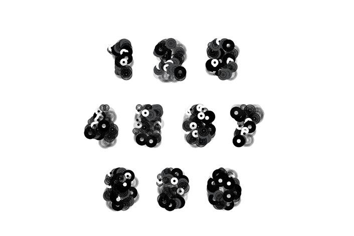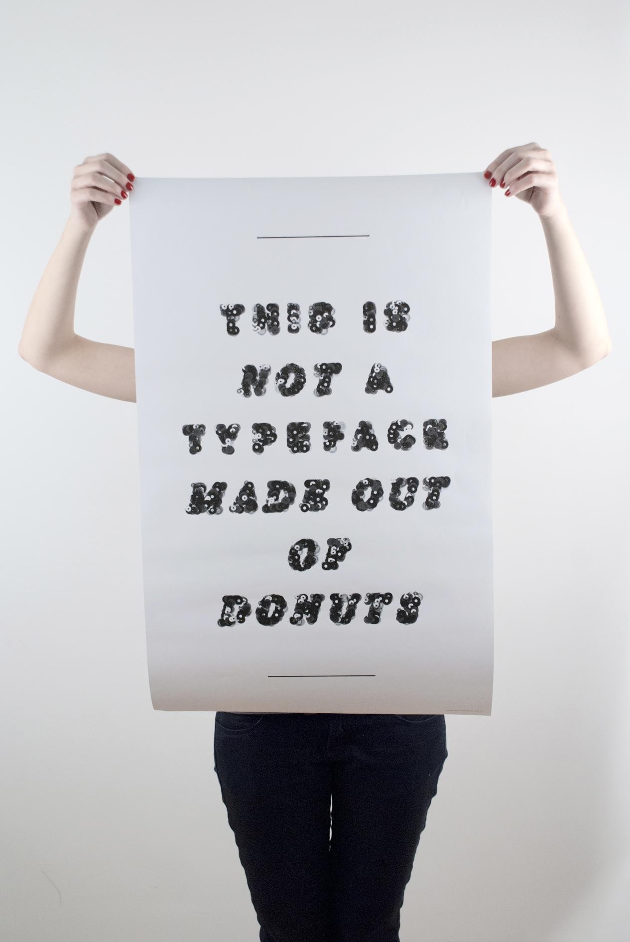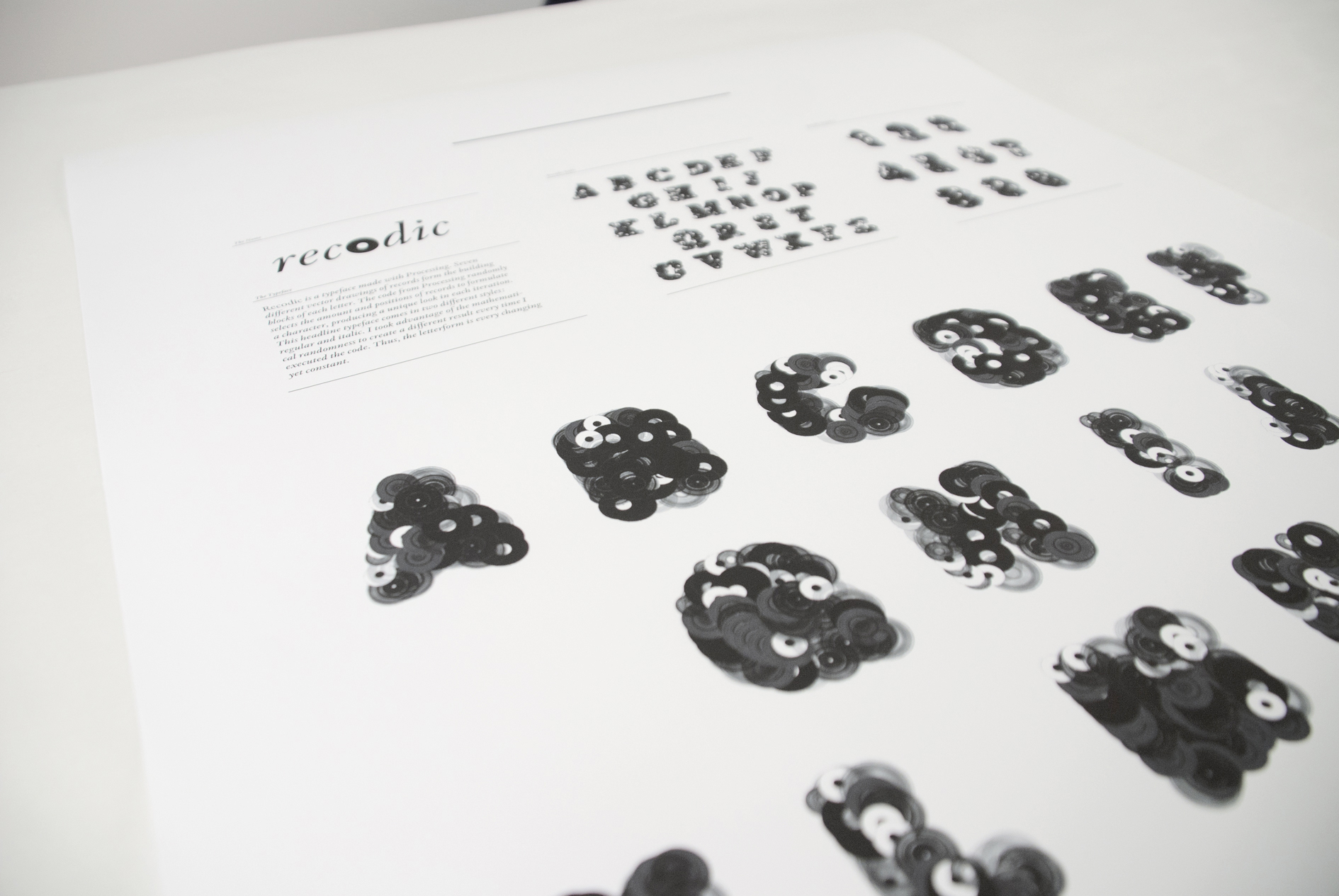 A typeface following the concept of the book "This is not a book about Donuts", created with Processing. Seven vector drawings of records form the building blocks of each letter. The code randomly selects the amount and positions of records to formulate a character, producing a unique look in each iteration. By taking advantage of the mathematical randomness it creates a different result every time executing the code.Thus, the letterform is every changing yet constant. This headline typeface exists in regular and italic. 2011